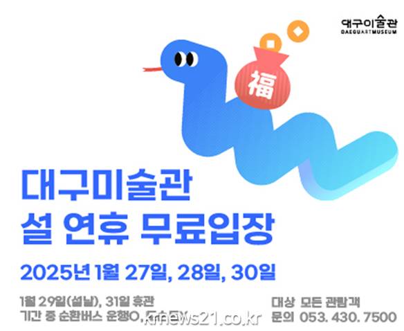 대구미술관은 설 당일인 1월 29일(수)과 31일(금) 휴관하고, 연휴 기간 27일(월)~28일(화), 30일(목) 무료로 개관한다. 기간 중 순환버스는 운영하고, 도슨트(전시해설)는 운영하지 않는다.