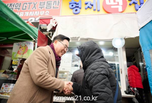 강수현 양주시장이 27일 오후 설을 앞두고 관내 덕정 재래시장을 찾아 ‘민생 현장’을 살펴보고 지역 상인들을 격려하고 있다.