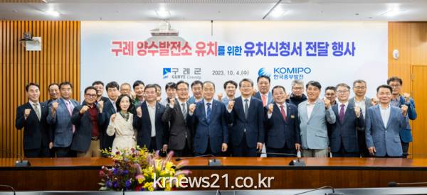 김순호 군수는 유시문 구례군의회 의장, 정만수 문척면 양수발전소 유치위원장 등 30여 명과 함께 충남 보령시 중부발전 본사를 찾아 김호빈 중부발전 사장에게 유치의향서를 건넸다.구례군은 지난 5월 중부발전과 업무협약을 맺고 입지 조사를 거쳐 500MW(0.5GW)급 발전소 부지 후보로 문척면 일대를 선정했다.이후 24차례의 주민설명회와 현장 견학을 시행하는 등 주민 수용성 확보를 위해 노력했다.문척면 주민 110여 명은 지난 8월 '문척면 양수발전소 유치 위원회'를 출범했고, 지난달 25일에는 양수발전소 유치를 응원하는 3천여 명의 군민이 '구례양수발전소 유치 응원단(서포터즈)' 발대식을 개최했다.양수발전소는 전력 수요가 적은 시간대에 하부의 물을 상부로 끌어올렸다가 전력 수요가 많을 때 물을 떨어뜨려 전력을 생산하는 친환경 발전 시설이다.군 관계자는 “송전선로가 구례 양수발전소 건설 후보지를 지나고 있어 송전선로 추가 건설에 따른 민원 가능성이 없는 점 등이 강점이다”고 말했다.김순호 구례군수는 "1조 원이 투입될 대형 국책 사업에 선정되면 막대한 자금이 지역에 유입되고 일자리가 창출되어 지역 소멸 위기 극복에 큰 도움이 될 것"이라며 "군민의 염원을 담아 양수발전소 유치에 전력을 다하겠다"고 말했다.보도자료 제공: 기획예산실 061-780-2997