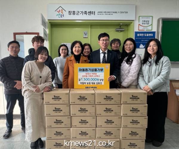 ▲ 사진=장흥군장흥군은 23일 장흥군4-H연합회 김동건 직전회장이 장흥군가족센터에 장흥지역에서 생산된 가루쌀과 우리밀로 만든 크래커 20박스(시가 1,500,000원)를 기부했다고 밝혔다.