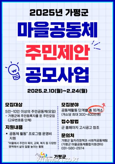 공모와 관련한 자세한 사항은 가평군청 홈페이지를 참고하거나 일자리정책과 사회적공동체팀(☎031-580-2974)으로 문의하면 된다.