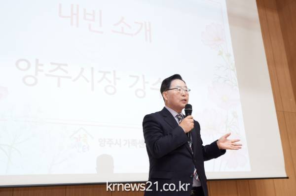 강수현 양주시장이 13일 오전 관내 ‘양주다울림센터 1층 소극장’에서 개최된 ‘2025년 아이돌보미 교육 및 집담회’에 참석해 일·가정 양립을 위해 ‘구슬땀’을 흘리는 아이돌보미들을 격려하고 아이들의 세심한 돌봄을 당부했다.