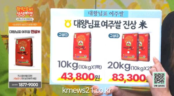 여주쌀 진상미 방송은 1일 최대 3회, 주간 최대 21회 방송되며 홈쇼핑 판매 가격은 특가로 10kg은 43,800원, 20kg은 83,300원에 판매 된다.