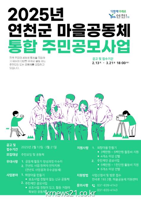▲ 사진=연천군청연천군은 다음달 17일부터 21일까지 신규 마을공동체를 발굴하고 지역 주민의 활동을 지원하기 위해 ‘2025년 마을공동체 주민 제안 및 희망마을 만들기 통합 주민공모사업’ 신청을 받는다고 밝혔다.