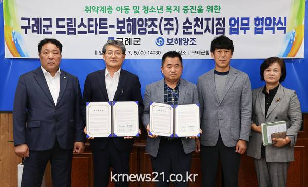 전남 구례군(군수 김순호)은 지난 5일 보해양조(주) 순천지점(지점장 노현옥)과 ‘지역사회 공헌 사업’ 추진을 위한 업무 협약을 체결했다고 밝혔다.