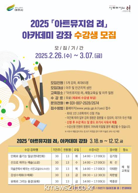 ▲ 사진=여주시여주시(시장 이충우) 미술관 「아트뮤지엄 려」는 2025년 아트뮤지엄 려 아카데미 프로그램을 운영하고자 수강생을 모집한다. 이번에 진행되는 성인강좌 프로그램은 5개 강좌(유화, 수채화, 사진, 소묘, 현대민화)이며 상·하반기 15주씩, 총 30주 과정으로 운영한다.