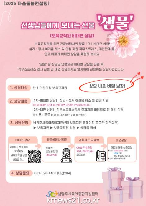 ▲ 사진=남양주시남양주시(시장 주광덕)는 보육 교직원 마음돌봄컨설팅 사업의 일환인 비대면 심리 상담실 ‘샘물’을 운영한다고 27일 밝혔다.