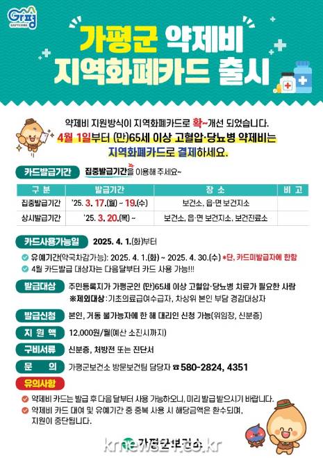 군은 현재 65세 이상 고혈압‧당뇨병 환자에게 매월 1만2,000원의 약제비를 지원하고 있는데, 4월 1일부터 기존의 약국 차감 방식에서 ‘가평군 약제비 지역화폐카드’ 결제 방식으로 변경된다. 이에 따라 모든 지원 대상자는 약국 방문 전에 반드시 가평군 약제비 지역화폐카드를 발급받아야 한다.