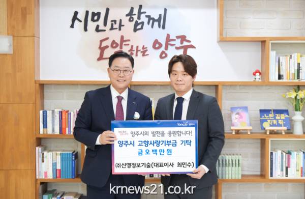▲ 사진=양주시양주시(시장 강수현)가 6일 오후 ‘㈜신영정보기술(대표이사 최민수)’에서 지역 발전을 위한 고향사랑기부금 500만 원을 전달했다고 밝혔다.