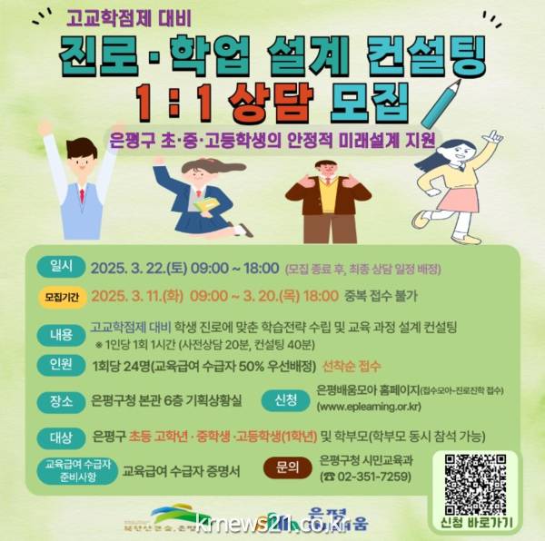 ▲  사진=은평구청서울 은평구(구청장 김미경)는 2025학년도 고교학점제 시행에 따른 고교학점제 이해와 개인 진로에 따른 적정 과목 선택을 위한 ‘고교학점제 대비 진로·학업 설계 컨설팅’을 선제적으로 시행한다고 밝혔다.