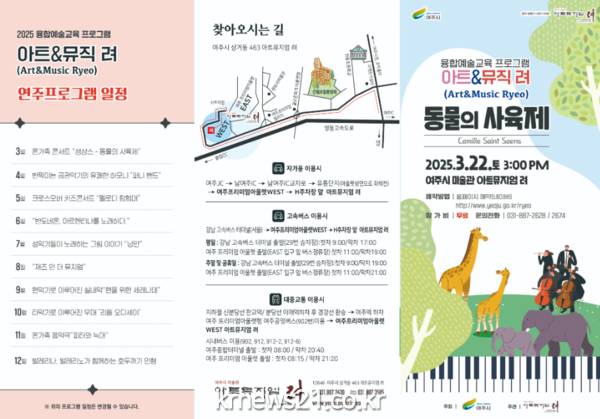 3월 ‘아트&뮤직 려(Art&Music Ryeo)’ 프로그램은 ‘생상스의 동물의 사육제’라는 주제로 프로그램을 구성했으며, 콘서트가이드 겸 바이올린 이세영 / 피아노 전희진, 전현주 / 바이올린 남윤주 / 첼로 김은송 / 더블베이스 강지나 / 플루트 이상혁 / 클라리넷 유영효 / 타악기(신디) 허혜임이 참여한다.