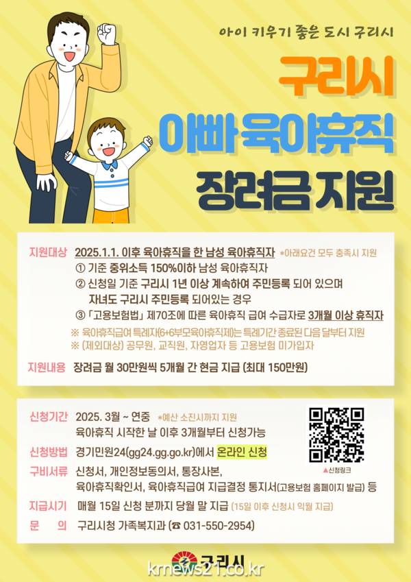 지원 대상은 올해 1월 1일 이후 육아휴직을 시작하고 육아휴직 급여 지급 요건을 충족한 고용보험 가입자인 신청일 기준 3개월 이상 휴직 중인 아빠로, 대상 자녀가 구리시에 주민등록 되어있고 아빠 본인도 1년 이상 구리시에 주민등록 되어있어야 한다.