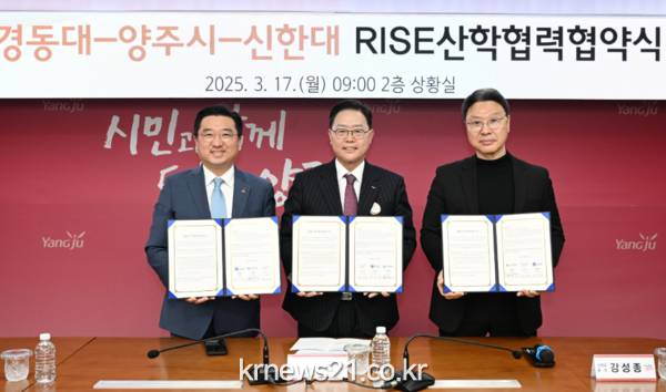 ▲ 사진=양주시양주시(시장 강수현)가 17일 오전 경동대학교(총장 전성용)·신한대학교(총장 강성종)와 함께 ‘RISE’의 기술 발전 및 네트워크 구축을 위한 산학협력 업무협약을 체결했다고 밝혔다.