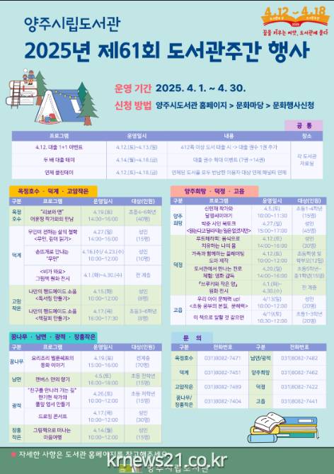 ▲ 사진=양주시청양주시 도서관은 2025년 제61회 도서관 주간(4월 12일~18일)을 맞아 ‘꿈을 키우는 씨앗, 도서관에 묻다’라는 주제로 다양한 독서 문화 행사를 운영한다.