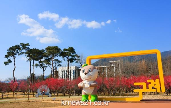 ▲ 사진=구례군청구례 섬진강의 맑은 물길과 어우러진 섬진강 수달생태공원에 홍매화가 화사하게 만개해 방문객들의 발길을 사로잡고 있다.