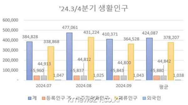 이는 지난 2분기에 이어 연속 1위를 기록한 것으로, 3분기 평균 생활인구는 주민등록인구 4만 4,842명, 외국인 등록인구 1,038명과 체류인구 37만 8,207명을 더한 42만 4,087명으로 집계됐다.
