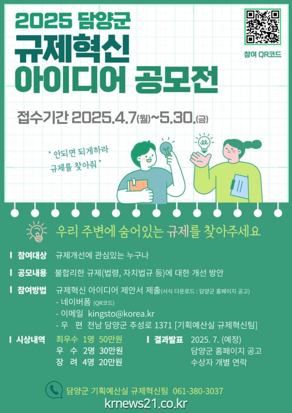 공모전에 대한 자세한 내용은 담양군청 기획예산실 규제혁신팀(☎ 061-380-3037)으로 문의하거나 군청 누리집 공고를 통해 확인할 수 있다.