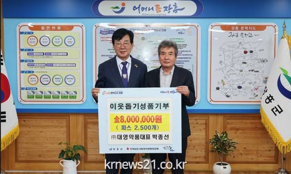 ▲ 사진=장흥군청(주)대영약품(대표 박종선)은 17일 사회공헌 활동의 일환으로 8백만원 상당의 파스 2,640개를 장흥군에 기탁했다.