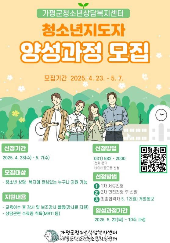 교육은 가평군 청평면에 위치한 가평군청소년상담복지센터에서 진행되며, 주요 내용은 △청소년 집단상담 △교육 프로그램 기획 및 운영 등으로 구성된다. 교육비는 전액 무료이나, 일부 상담 관련 과정은 자부담이 발생할 수 있다.