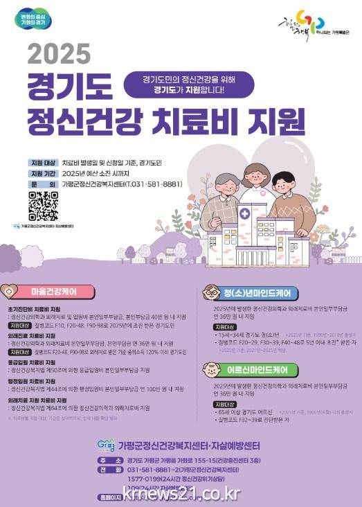 가평군정신건강복지센터는 “센터는 정신건강 치료비 지원과 더불어 등록 대상자에게 지속적인 상담과 치료 연계를 제공하고, 심리지원 프로그램과 정신건강 예방 사업도 병행하고 있다”며 “모든 세대가 마음 건강을 지킬 수 있도록 적극적인 지원을 이어가겠다”고 밝혔다.