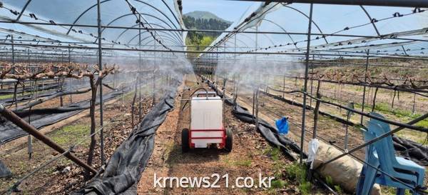 이와 함께 도입된 이동형 포도 과원 맞춤형 스마트 방제기는 리모컨으로 조작되며, 음성안내 기능을 갖춰 장애물 회피, 소모품 교체 시점 등을 안내해 고령 농업인의 작업 편의성을 높였다. 특히 포도 재배 환경에 맞춰 바퀴 조향장치를 탑재해 하우스 비닐을 손상시키지 않도록 설계됐고, 수확기에는 방제기를 운반차로 활용할 수 있도록 분리형 구조로 제작됐다.