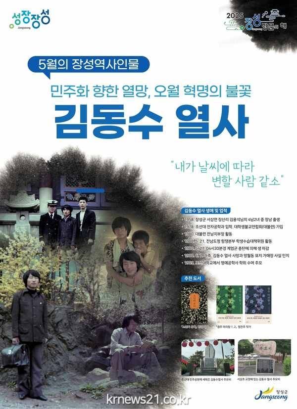 1958년 서삼면 장산리 숲실마을에서 태어난 김동수 열사는 1978년 조선대학교 전자공학과에 입학했다. 입학과 동시에 대학생불교연합회에 가입하고, 민주화 항쟁에도 동참했다.1980년 5‧18민주화운동 이후부터는 전남도청 항쟁본부 학생수습대책위원으로 활동했다. 같은 해 5월 27일 전남도청 2층 민원실에서 계엄군 총탄에 의해 스물셋 꽃다운 생을 마감했다.지금도 숲실마을에 가면 김동수 열사의 생가가 보존되어 있다. 장성 서삼초등학교 정문과 조선대학교에는 추모비도 세워져 있다.장성군은 오는 14일 장성문화예술회관 소공연장에서 제45주년 5‧18민주화운동 기념식을 갖고 김동수 열사를 추모한다. 15일부터는 문향고등학교와 장성군청 1층에서 사진전도 연다. 24일에는 서삼면 장산리 임곡마을회관 앞에서 김동수 열사 추모문화제를 가질 계획이다.11월 11일에는 장성문화예술회관 대공연장에서 김동수 열사의 생애를 담은 창작 창극 ‘그대 먼 길 돌아 여기에’도 선보인다.