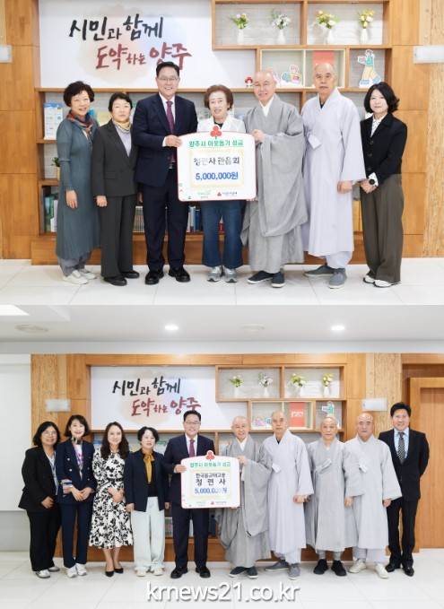 강수현 시장은 “매년 꾸준히 이웃을 위해 따뜻한 손길을 보내주신 청련사와 관음회에 깊은 감사를 드린다”며 “소중한 성금은 꼭 필요한 이웃들에게 잘 전달해 모두가 함께 따뜻해지는 양주시를 만드는 데 소중한 밑거름이 될 것”이라고 말했다.