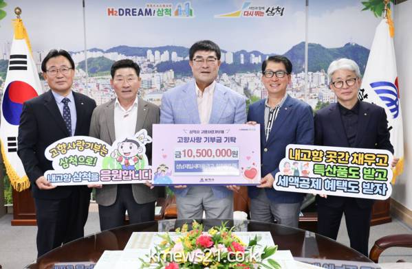 ▲ 사진=삼척시□ 성남제일새마을금고(이사장 김중옥)와 삼척도원새마을금고(이사장 정준화) 임직원은 12일 삼척시를 방문하여 고향사랑기부금 1,050만 원을 전달했다.