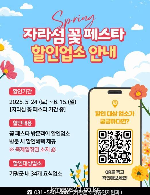군에 따르면 24일부터 6월 15일까지 진행되는 이번 꽃 축제 기간 동안 가평군 내 음식점, 카페 등 34개 업소에서 방문객에게 할인 등의 혜택을 제공한다. 관광객은 자라섬 입구에 비치된 리플릿이나 전용 온라인 링크(https://m.site.naver.com/1GxtG)를 통해 할인업소를 확인할 수 있으며, 꽃 페스타 방문 영수증을 제시하면 해당 혜택을 받을 수 있다.