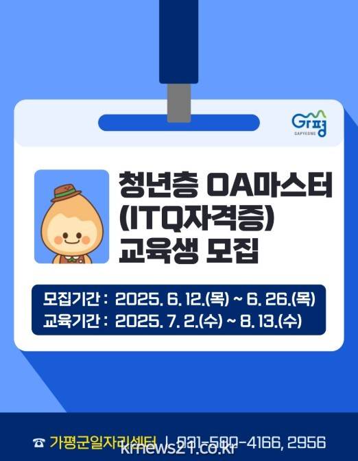 가평군(군수 서태원)은 이달 12일부터 청년층을 위한 맞춤형 취업지원 프로그램 ‘OA마스터(ITQ자격증) 취득 과정’ 참여자를 모집한다고 밝혔다. 교육은 7월 2일부터 8월 13일까지 총 100시간 과정으로 운영되며, 수료자에게는 취업 알선 및 연계 지원도 제공할 예정이다.