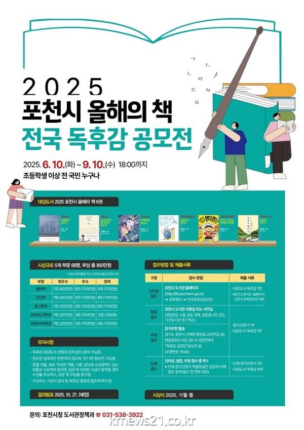 공모 대상 도서는 ‘2025년 포천시 올해의 책’ 6권으로 △「작별하지 않는다」(한강) △「찌그러져도 동그라미입니다」(김창완) △「오백년째 열다섯」(김혜정) △「달팽이도 달린다」(황지영) △「이야기 귀신이 와르릉 와르릉」(천효정) △「포천의 택리지」(유예숙) 등이다.