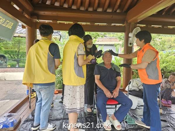 ▲ 사진=담양군청대덕면 지역사회보장협의체(민간위원장 김태수, 공공위원장 나숙자)는 최근 입석마을회관에서 거동이 불편하거나 교통 여건상 미용실 이용이 어려운 어르신과 주민 20여 명을 대상으로 이·미용 봉사 활동을 진행했다고 13일 전했다.