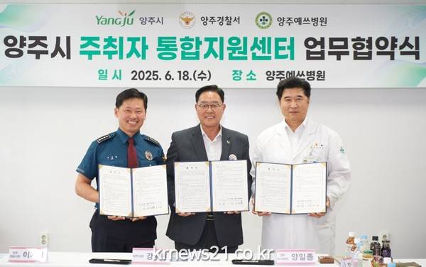 시는 18일 오후 덕정동에 소재한 ‘양주예쓰병원’에서 ▲양주경찰서(서장 이기범), ▲양주예쓰병원(원장 양일종)과 함께 ‘주취자 통합지원센터’ 운영을 위한 ‘3자 협약식’을 체결했다고 밝혔다.