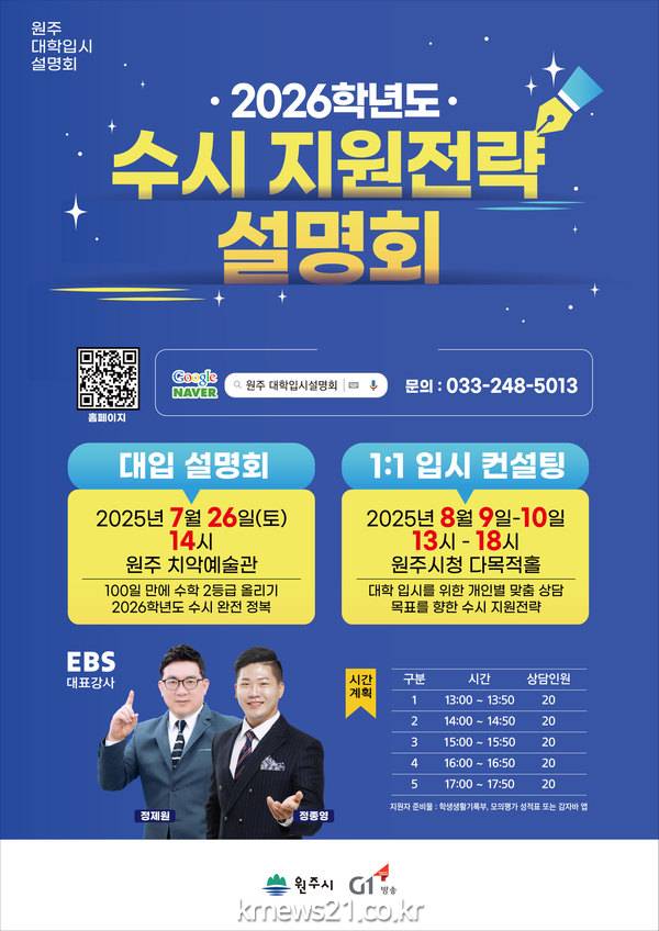 원주시는 수험생과 학부모에게 최고의 대입 정보를 제공하기 위해 G1방송과 함께 ‘2025년 원주 대학입시설명회’를 개최한다. 올해로 7년째를 맞는 원주 대학입시설명회는 7월 수시 지원 전략 설명회를 시작으로 8월 1차 1:1 입시컨설팅, 12월 2차 1:1 입시컨설팅 등 총 3차례에 걸쳐 진행된다. 오는 26일(토) 치악예술관에서 열리는 ‘2026학년도 수시 지원전략 설명회’에서는 EBS 대표 강사진(수학 정종영, 입시 정제원)으로 구성된 최고의 입시 전문가들이 수험생들이 가장 어려워하는 수학 교과목 학습법과 함께 최신 입시 정책 및 제도 변화에 따른 대응 전략을 안내할 예정이다. 이어 다음 달 9일(토)과 10일(일) 양일간 원주시청 지하1층 다목적홀에서 진행되는 ‘1차 1:1 입시컨설팅’에서는 학교생활기록부와 모의고사 성적 등 기초자료를 바탕으로, 입시 전문가가 수시 전략 수립을 위한 1:1 맞춤형 상담이 진행된다. 또한 12월 예정된 ‘2차 1:1 입시컨설팅’에서는 예비 수험생을 위한 학습전략과 정시 지원 전략상담 등을 지원할 계획이다. | |