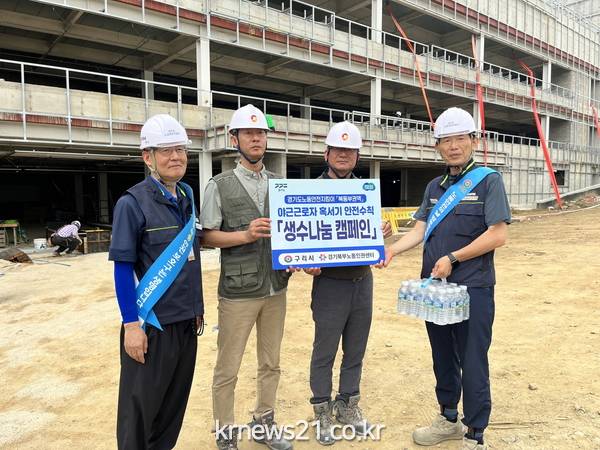▲ 사진=구리시청구리시(시장 백경현)는 지난 3일 노동안전의 날을 맞아 검배근린공원 공영주차장 건립 공사 현장에 방문하여 폭염 대비 옥외 근로자 안전점검 및 생수 나눔 캠페인을 실시했다고 밝혔다.