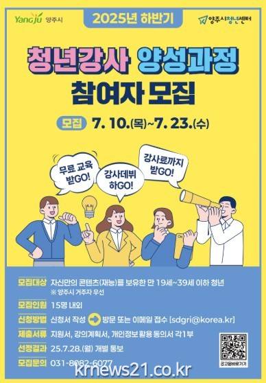 ▲ 사진=양주시청양주시(시장 강수현)는 청년의 재능을 전문 강의 역량으로 발전시키는 “2025 하반기 청년강사 양성과정”을 모집 및 운영한다고 밝혔다.