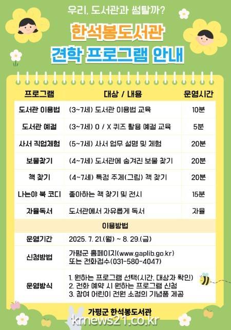 견학 프로그램 신청은 가평군도서관 홈페이지(www.gaplib.go.kr) 또는 전화(한석봉도서관 ☎031-580-4047)를 통해 가능하다.
