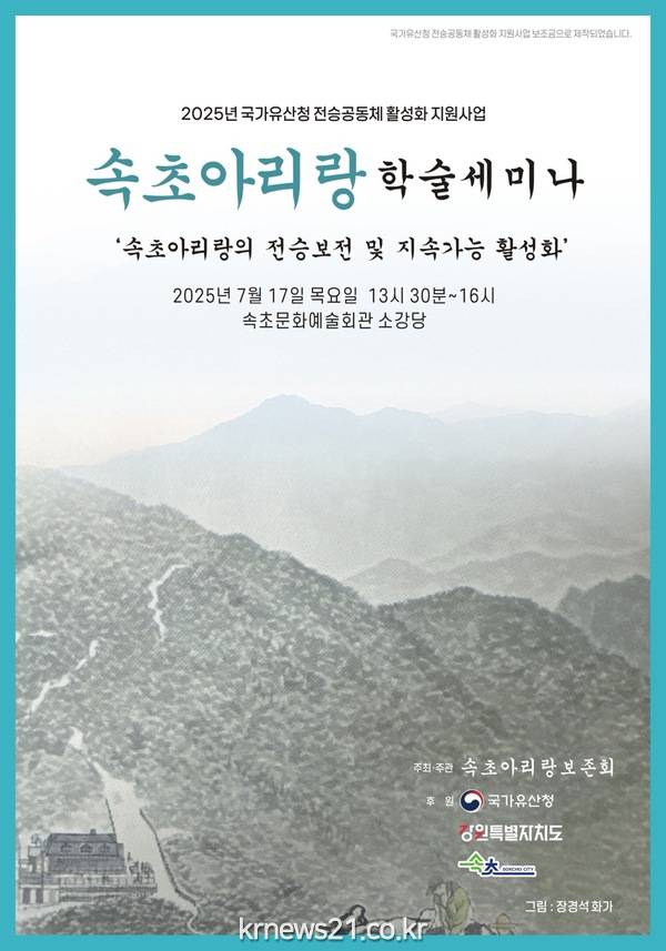 이번 세미나는 2025년 전승공동체 활성화 지원사업의 하나로, 속초아리랑의 보전과 발전 가능성을 학술적으로 모색하기 위해 마련됐으며, 국가유산청, 강원특별자치도, 속초시가 후원한다. 특히, 지난해 5월, 속초아리랑이 강원특별자치도 무형유산으로 지정된 이후 처음 열리는 학술적 전승 기반 마련 행사라는 점에서 더욱 큰 의미가 있다.