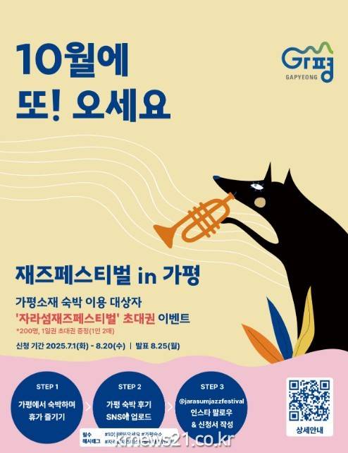 참여 방법은 간단하다. 캠페인 기간(7월 1일~8월 20일) 중 가평 소재 숙박시설에서 휴가를 즐긴 후, SNS에 가평 여행 및 숙박 후기를 필수 해시태그(#10월에또오세요 #자라섬재즈페스티벌 #재즈인가평 #가평숙소)를 포함하여 게시하고, 자라섬재즈페스티벌 인스타그램(@jarasumjazzfestival) 프로필 링크 내 구글폼을 작성하면 이벤트에 응모된다.