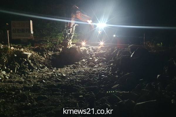 군에 따르면 지난 20일 새벽 북면 백둔리 백둔교 인근 도로가 산사태로 유실됨에 따라, 해당 구간에 대한 응급복구 작업을 21일 자정이 넘은 밤 12시 30분까지 강행했다. 군은 추가 피해를 막기 위해 현장에 인력과 장비를 즉시 투입하고, 복구가 완료될 때까지 비상근무 체제를 유지하고 있다.