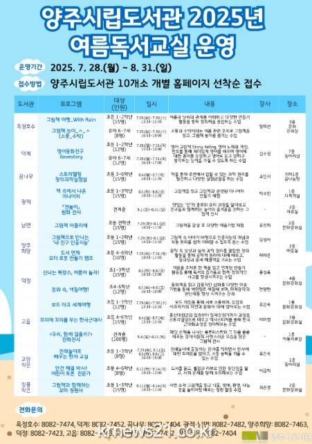 이번 여름독서교실은 7월 28일(월)부터 8월 31일(일)까지 양주시도서관 10개소에서 총 17개 강좌 및 전시로 진행된다.