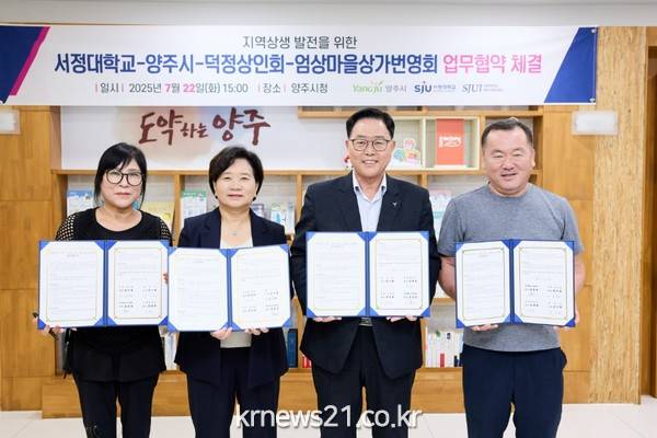 ▲ 사진=양주시청양주시(시장 강수현)가 지난 22일, 관내 대학인 서정대학교와 지역 골목상권인 덕정상인회, 엄상마을상가번영회 간 지역경제 활성화를 위한 업무협약을 체결했다고 밝혔다.
