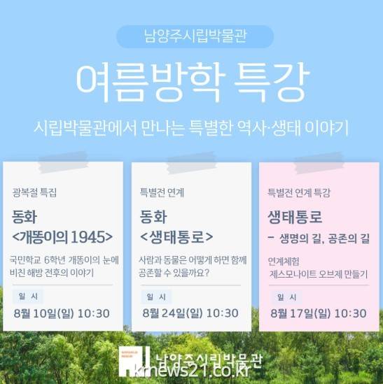 이번 특강은 무료로 운영되며, 교육 관련 세부 내용과 참가 신청은 7월 30일 오전 9시부터 남양주시립박물관 누리집에서 확인할 수 있다. 자세한 문의는 문화예술과 시립박물관운영팀(☎031-560-8600)으로 하면 된다.