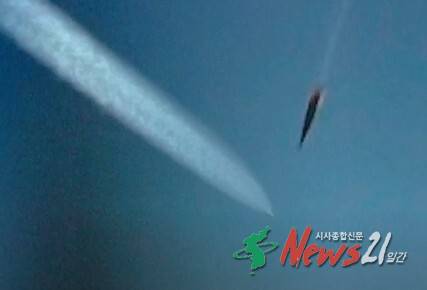 ▲ 사진=KBS NEWS 영상 캡처긴 비행운을 그리며 날아가는 미사일, 수직에 가깝게 활강하며 목표물을 타격.