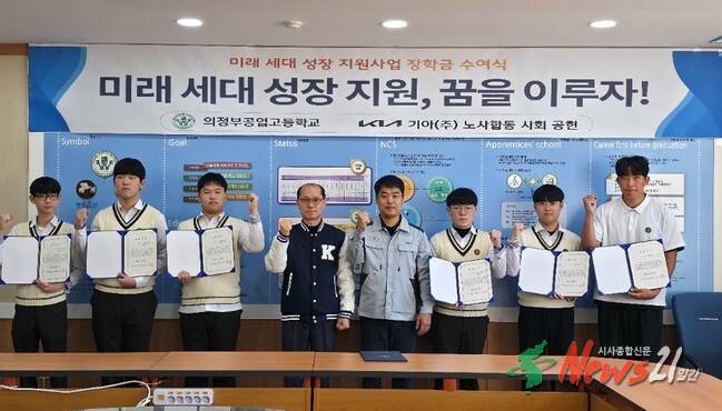 ▲ 사진=의정부시청의정부공업고등학교(교장 김주한, 이하 의정부공고)는 10월 24일(금), 기아(주) 노사합동 사회공헌 지정기탁금으로 마련된 장학금을 재학생들에게 전달하고, 학교 발전에 기여한 기아(주)에 감사장을 전달했다.