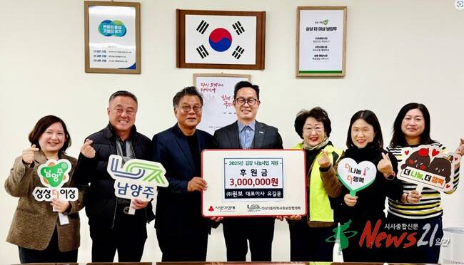 ▲ 사진=남양주시청남양주시(시장 주광덕)는 29일 ㈜원보(대표이사 유길문)가 다산1동 지역사회보장협의체(위원장 정순옥)에 김장 나눔 사업비로 300만 원을 지정기탁했다고 밝혔다.
