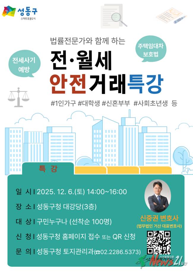 ▲ 사진=성동구청서울 성동구(구청장 정원오)는 오는 12월 6일 오후 2시 성동구청 3층 대강당에서 법률 전문가와 함께하는 ‘전월세 안전거래 특강’을 개최한다.