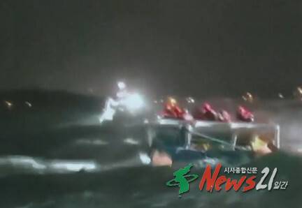 ▲ 사진=KBS뉴스영상캡쳐거센 파도 위로 뒤집힌 어선 한 척이 선체 일부만 드러낸 채 표류한다. 해경 구조대원들이 선원들을 확인하고 선박에 접근한다.