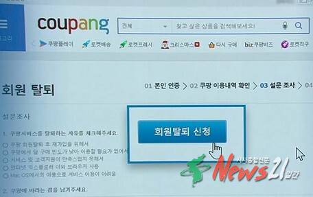 ▲ 사진=KBS뉴스영상캡쳐쿠팡 회원 탈퇴를 위해 앱에 접속하니 절차는 그야말로 ‘미로’에 가깝다. 어렵게 탈퇴 메뉴에 도달해도 앱에서는 처리가 불가능하다며 PC 버전으로 이동하라고 안내한다.