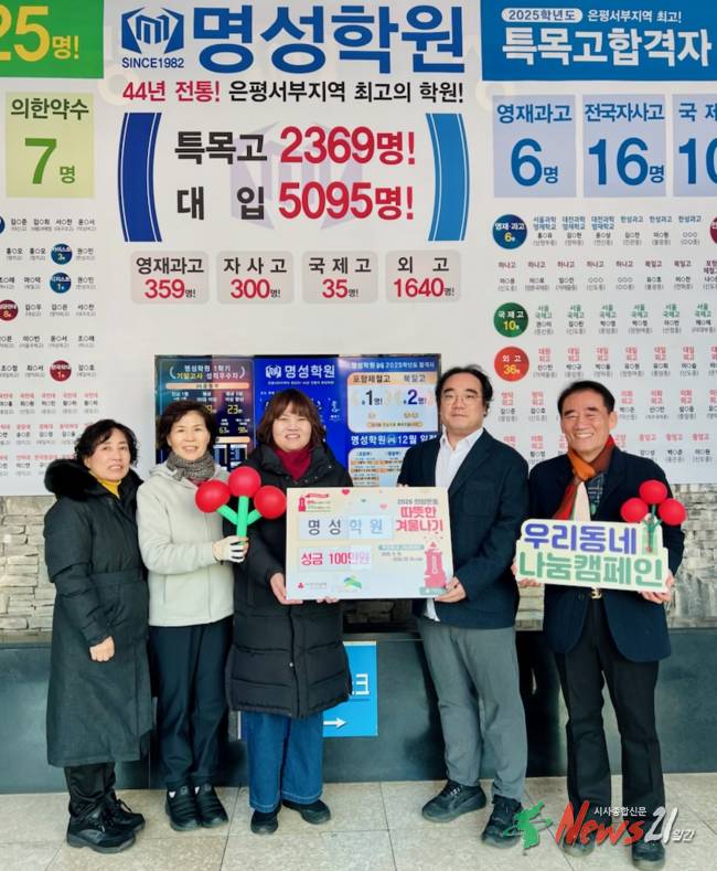 ▲ 사진=은평구서울 은평구(구청장 김미경) 응암1동은 지난 4일 명성학원에서 겨울철 취약계층을 돕기 위한 ‘2026. 희망온돌 따뜻한 겨울나기’에 성금 1백만 원을 기부했다고 밝혔다.